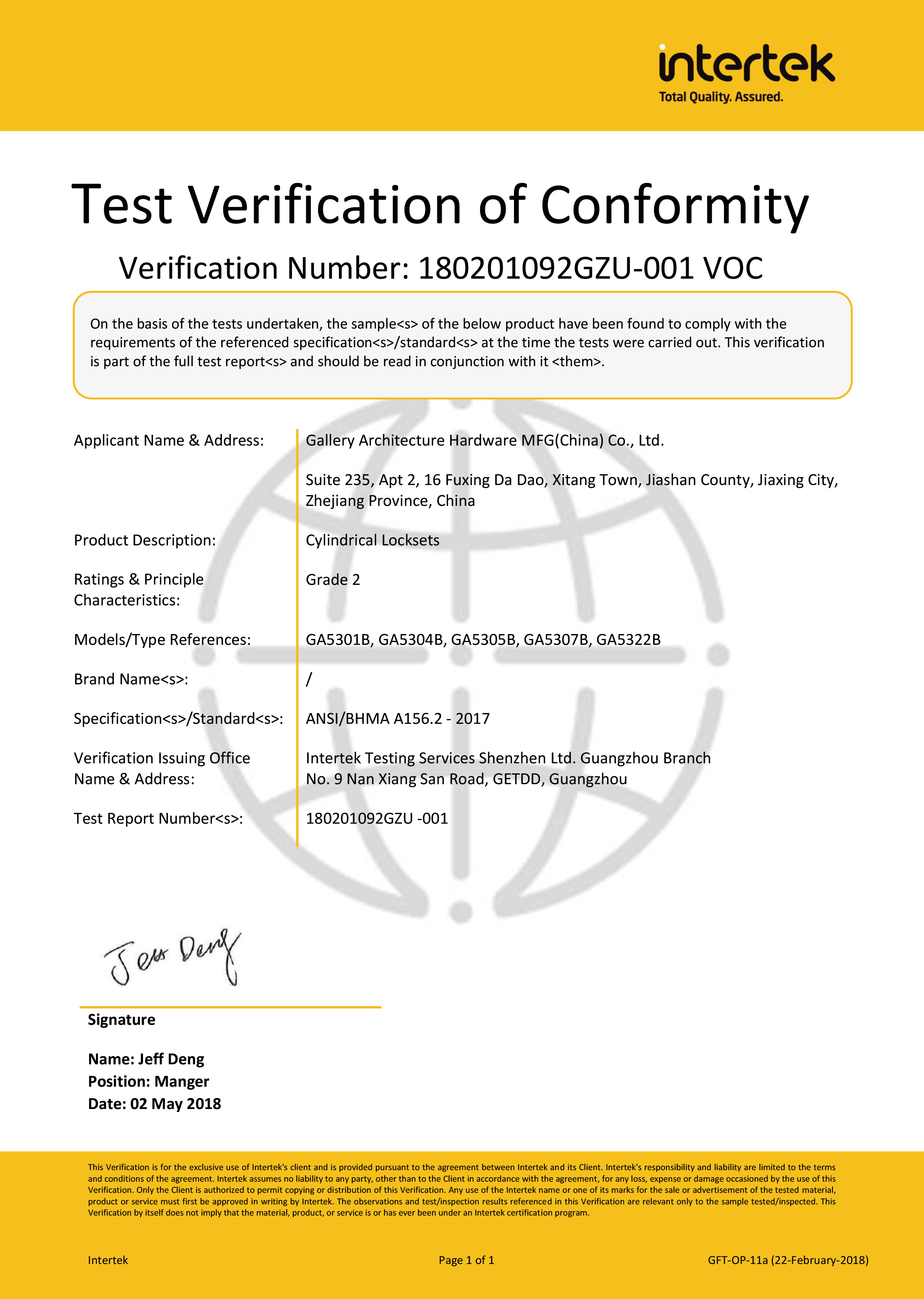 浙江堅迪五金制造有限公司始建于 1995 年。自 2003 開始,公司致力于高標準商業(yè)鎖的研發(fā)工作,并于 2006 及 2007 年,8700 插芯鎖系列獲得美國國家標準 ANSI A 156.13-2005 一級、ANSI A 156.2-2003 二級和美國 UL 10C3 小時防火測試認證。自 1998 年以來,公司不斷提升產(chǎn)品和客戶服務品質(zhì),并獲得了 ISO 9001 的認證。